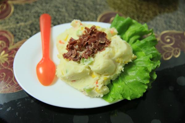 制作方法:將土豆洗干凈、去皮,玉米洗干凈,然后一起放入鍋中蒸熟;將蒸好的土豆放入保鮮袋中,用搟面杖搟成泥,玉米脫粒,備用;胡蘿卜、黃瓜、火腿切丁,放入開(kāi)水中焯一下,撈起備用;將所有材料混合在一起,加入適量鹽和3勺沙拉醬,拌勻即可。