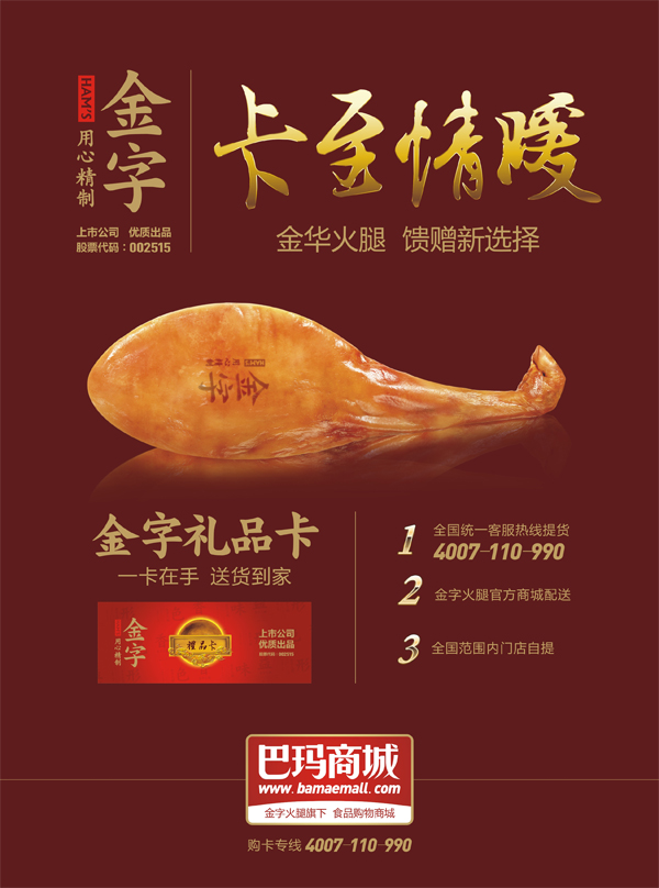 作為一家上市公司——金字火腿推出的禮品卡,禮品卡多年信譽,廣受消費者的真心歡迎,每年回頭客無數(shù),而更重要的是,金字每年把產(chǎn)品的品質(zhì)和備貨做到更好,禮品卡內(nèi)產(chǎn)品都是公司層層品質(zhì)歷練的熱銷產(chǎn)品,用火腿、臘肉、香腸這些實在心意,去感動每一位朋友。如今,更是可以通過手機(jī)微信關(guān)注金字火腿,盡享中華美食同時,與朋友分享禮品卡里所蘊含的真情實意。